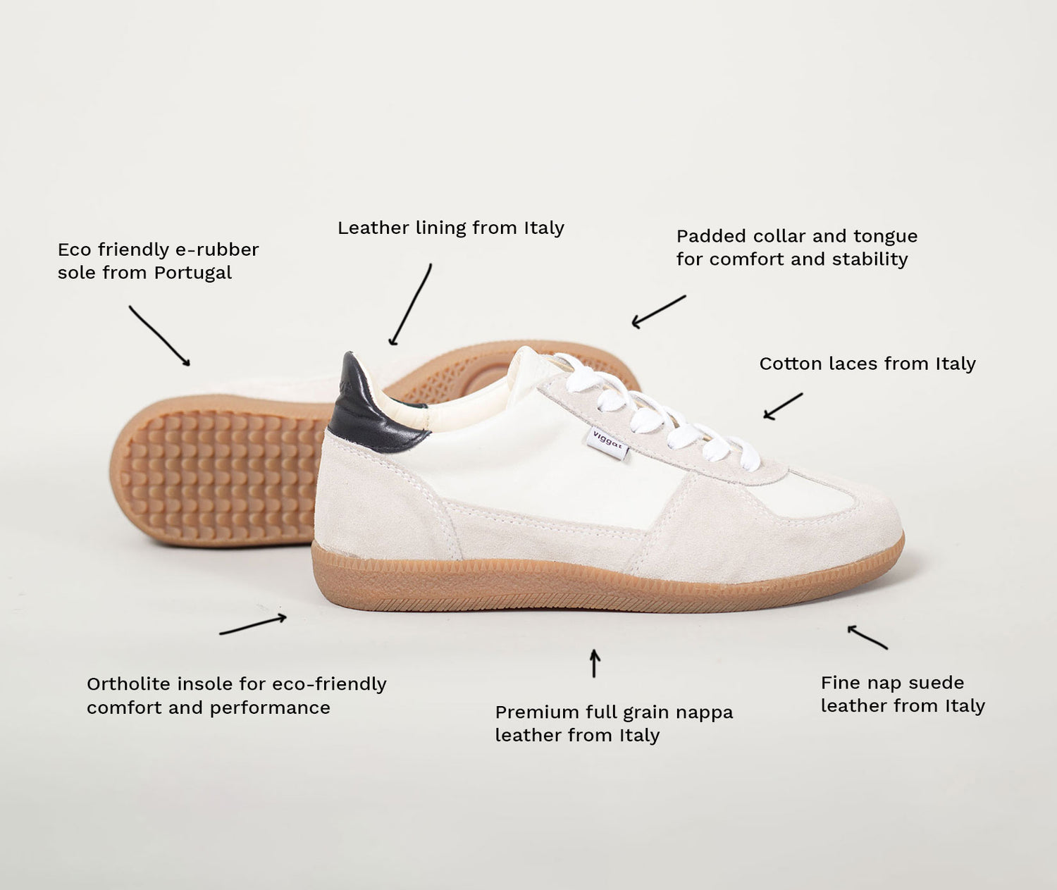 While creating our sneakers we set out to use traditional craftsmanship with high quality materials and sustainable sourcing decisions. Most of our materials are sourced from Italy, Spain, and Portugal. We use premium leather from LWG (Leather Working Group) gold-rated tanneries meaning they have been audited and shown to exhibit the highest standards regarding the environment, traceability, chemical management, and social governance. Most of our soles are constructed with e-rubber which is a mix of recycled rubber and SRB. Our Ortholite Hybrid insoles are made with 20% eco-content and wrapped in a sustainable, chrome-free lining. We will continually strive to improve our practices to bring you the most stylish and environmentally conscious sneakers possible.